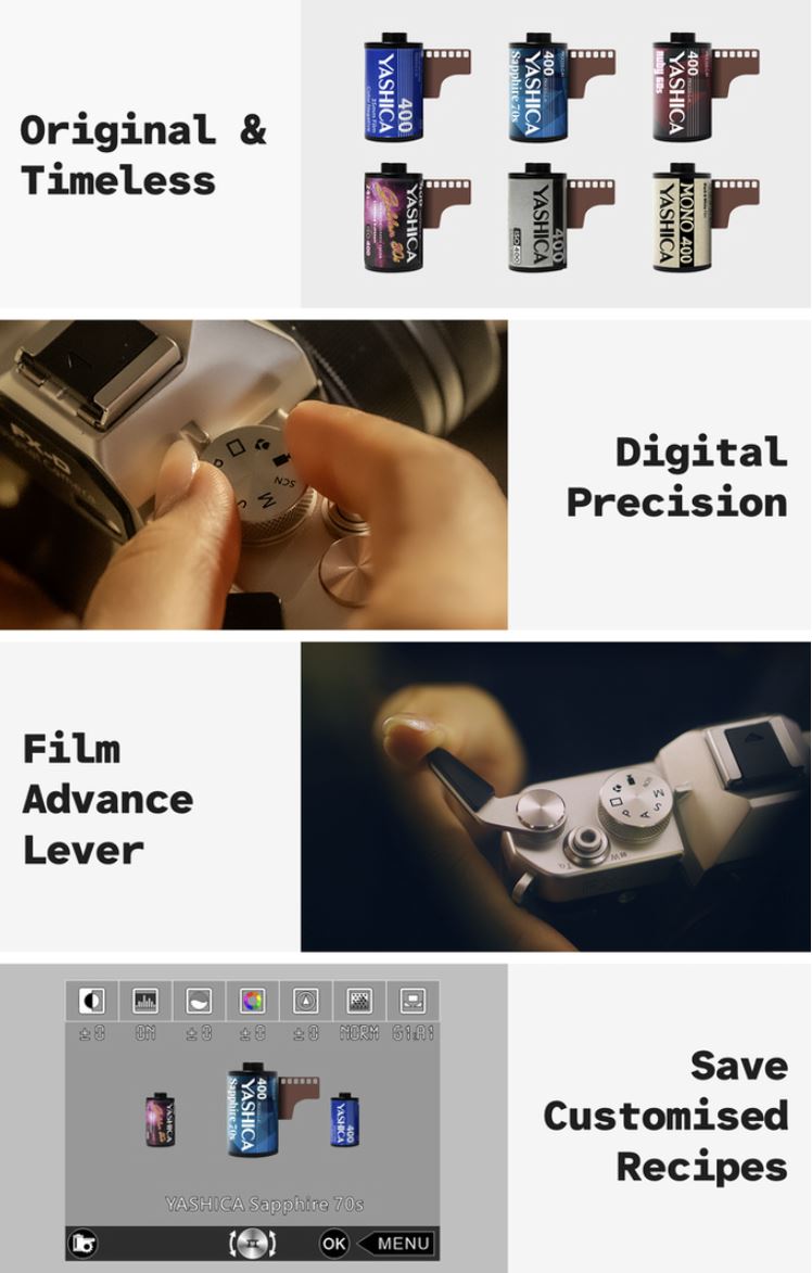 – ตัวกล้องมีโหมดจำลองฟิล์มสำเร็จรูปให้เลือกใช้ถึง 6 แบบ เช่น Yashica Sapphire 70s, Yashica 400, Ruby 60s, Golden 80s, Mono 400 และ B&W 400